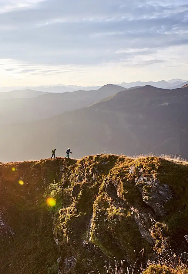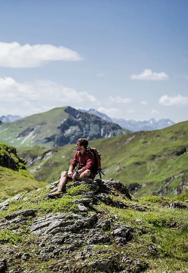 Wir packen unseren Rucksack, der mindestens 20 bis 30 Liter Fassungsvermögen haben sollte. Immerhin muss auch auf einer Tagestour viel Wichtiges mit. Nach einem kräftezehrenden Aufstieg braucht´s eine gscheide Jause, sportlichen Proviant wie Nüsse und Energieriegel und mindestens 1,5 Liter Wasser, um in Balance zu bleiben. Auch auf Wechselkleidung solltet ihr in eurem Urlaub in Saalbach nicht vergessen. Ein Funktionsshirt und eine Softshell-Jacke finden immer Platz und sorgen für ein angenehmes Körperklima, bei Sonnenstunden und Regenwetter.